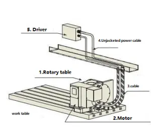 Divizör, aşağıdaki şekilde gösterildiği gibi genellikle birkaç parçadan oluşur: ① döner tabla gövdesi, ② dördüncü eksen motoru, ③ kılıflı kablo, ④ kılıfsız kablo ve ⑤ sürücü. Beş ana donanıma ek olarak, takım tezgahında dördüncü eksen için arayüz ayrılmalıdır.