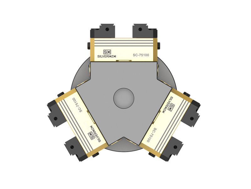 Bağlama kulesi üzerinde üç adet SilverCNC SC-75150 merkezleyici mengene monte edilmiştir.